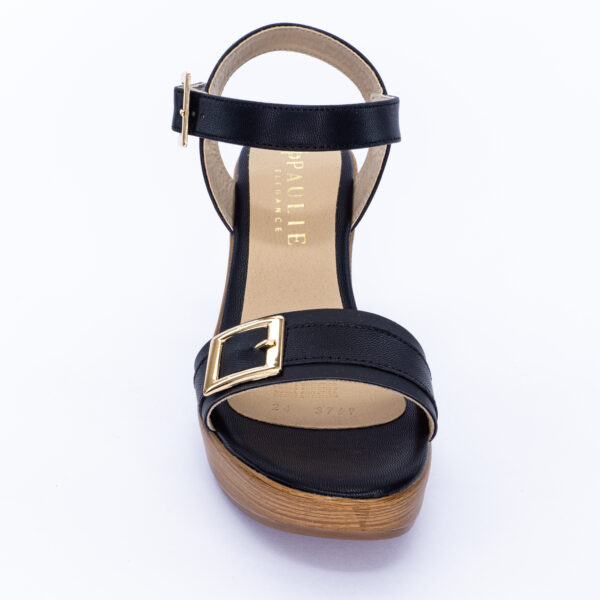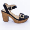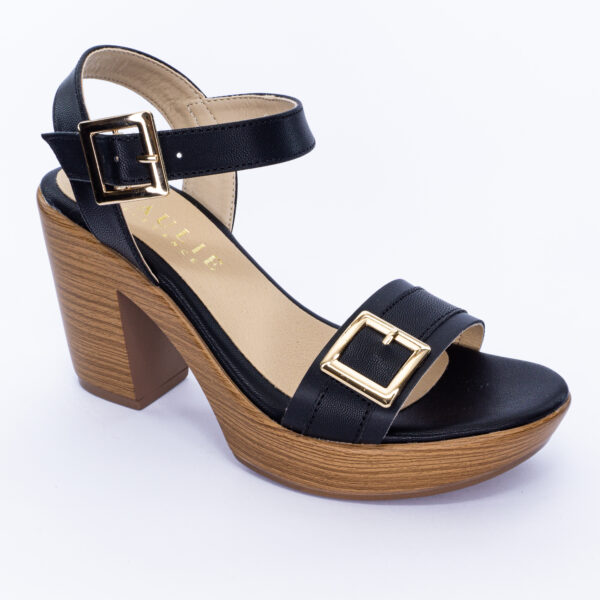 Sandalia con tacon grueso, presenta una tira ancha en la parte delantera y una correa ajustable con hebilla dorada que aporta un toque sofisticado en tono negro. Perfecta para ocasiones especiales o para darle un toque chic a tus outfits diarios.